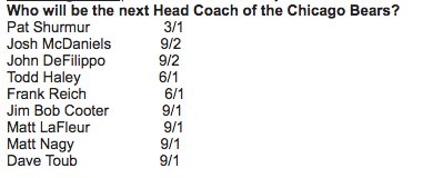 "It has been two days since the Chicago Bears fired John Fox and their search is in full force this week. It appears that they asked to speak with six playoff coaches, five of which are on a bye this weekend. According to various reports over the past couple days, the Bears have asked permission to speak with Kansas Chiefs offensive coordinator Matt Nagy who they cannot interview until after this Saturday's game between the Chiefs and the Tennessee Titans. We have also learned that the Bears will interview Minnesota Vikings offensive coordinator and former Cleveland Browns head coach Pat Shurmur and their defensive coordinator George Edwards as well. Former Denver Broncos head coach and current New England Patriots offensive coordinator Josh McDaniels will interview with the Bears over the weekend. The team will also speak with Philadelphia Eagles quarterbacks coach John DeFillippo as well as Carolina Panthers defensive coordinator Steve Wilks. Out of the first six candidates for the job, four of them are offensive coaches and two of those have head coaching experience. McDaniels might be the sexiest name on the list, but it unknown if he is willing to come to a team that will give him no control over the roster. DeFillippo is getting consideration because of the work he has done with Carson Wentz, who was the MVP favorite before suffering a season-ending knee injury. However, he has never even called plays at the NFL level so making the leap to head coach is a large one. Nagy and Shurmur are the best two out of this group. Nagy has worked under Andy Reid who has been one of the most creative offensive coaches of the past 20 years. Shurmur has had great success with both Sam Bradford and Case Keenum under center. If he can bring along Stefon Diggs and Adam Thielen with him the Bears could really have something. For what it's worth, Shurmur is the current odds on favorite to land the gig by the Bovada Sports Book in Las Vegas. "